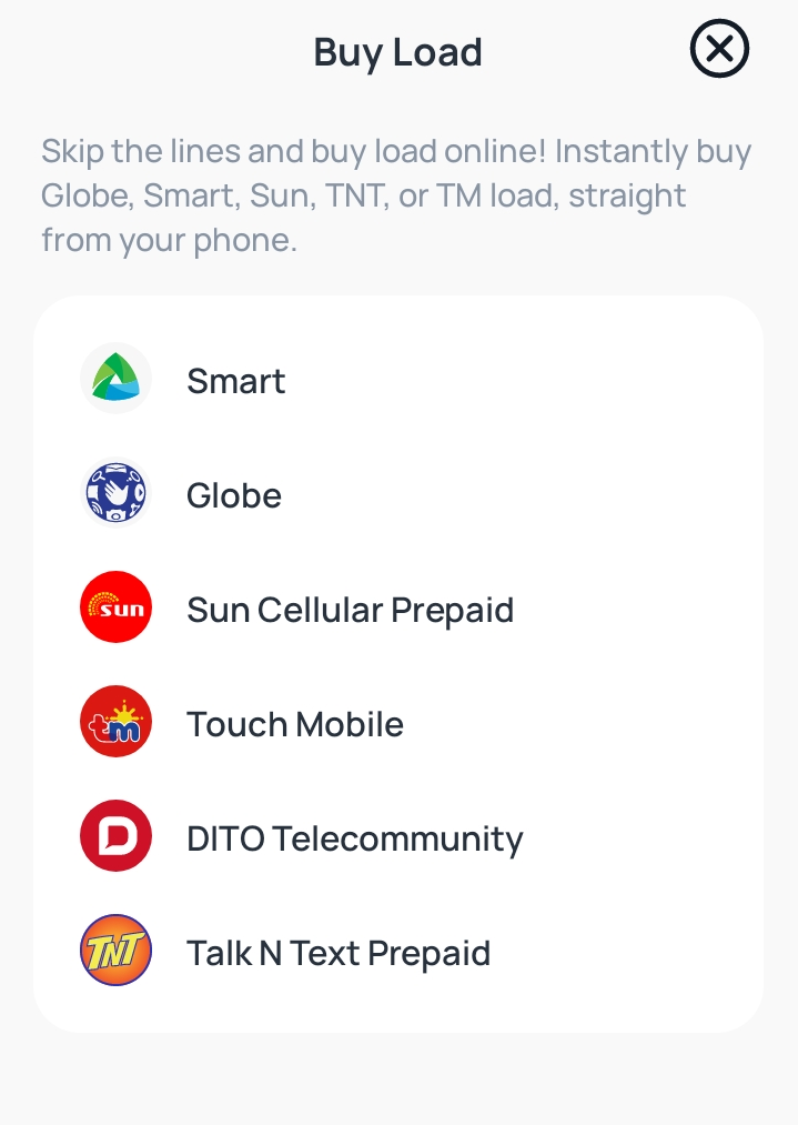 Coins.ph offers regular load and load promos for major Philippine telecommunications providers: