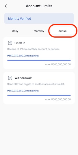 - Within the year, you have fully used up your Annual Withdrawal Limit of P120,000,000 through several outgoing Peso and crypto transactions.